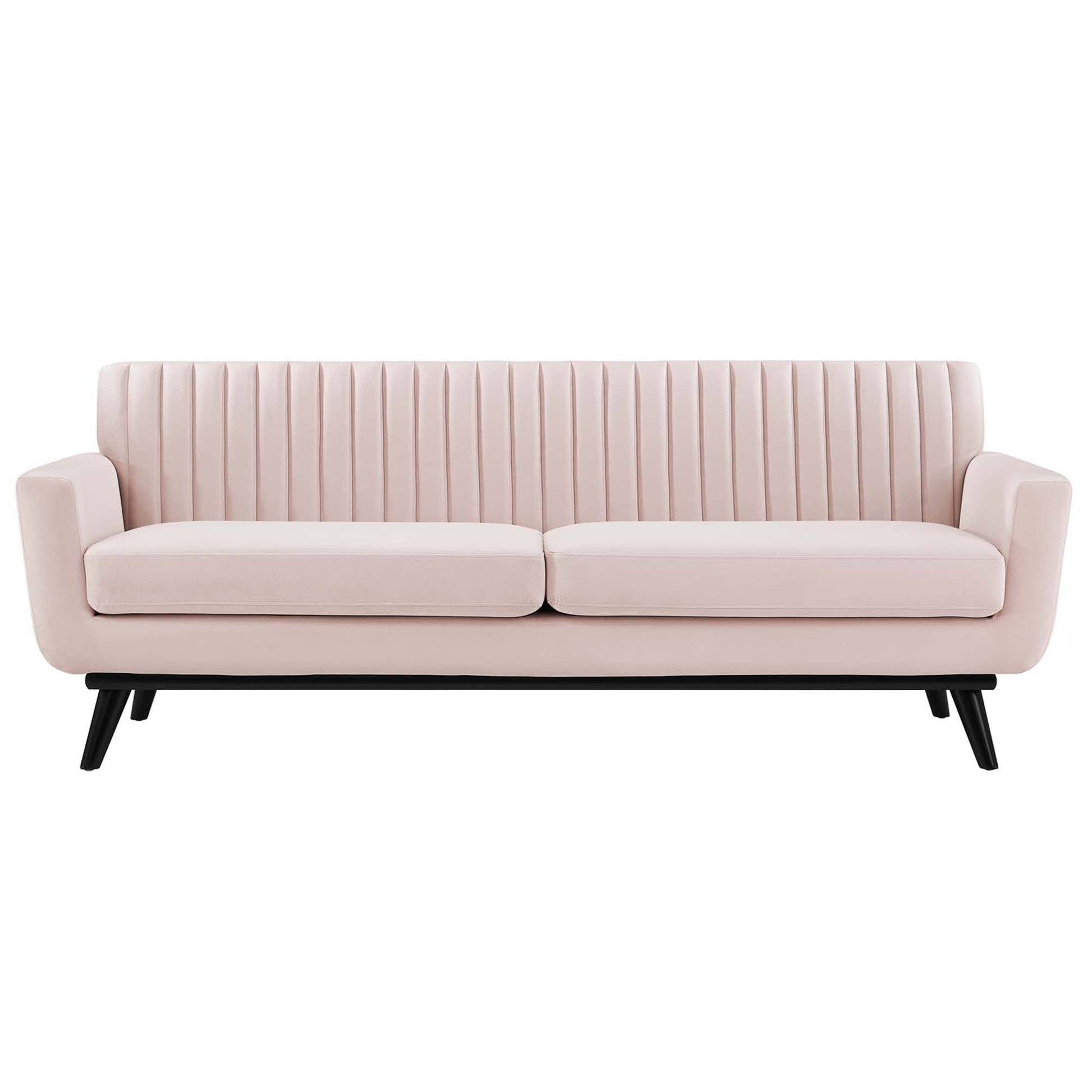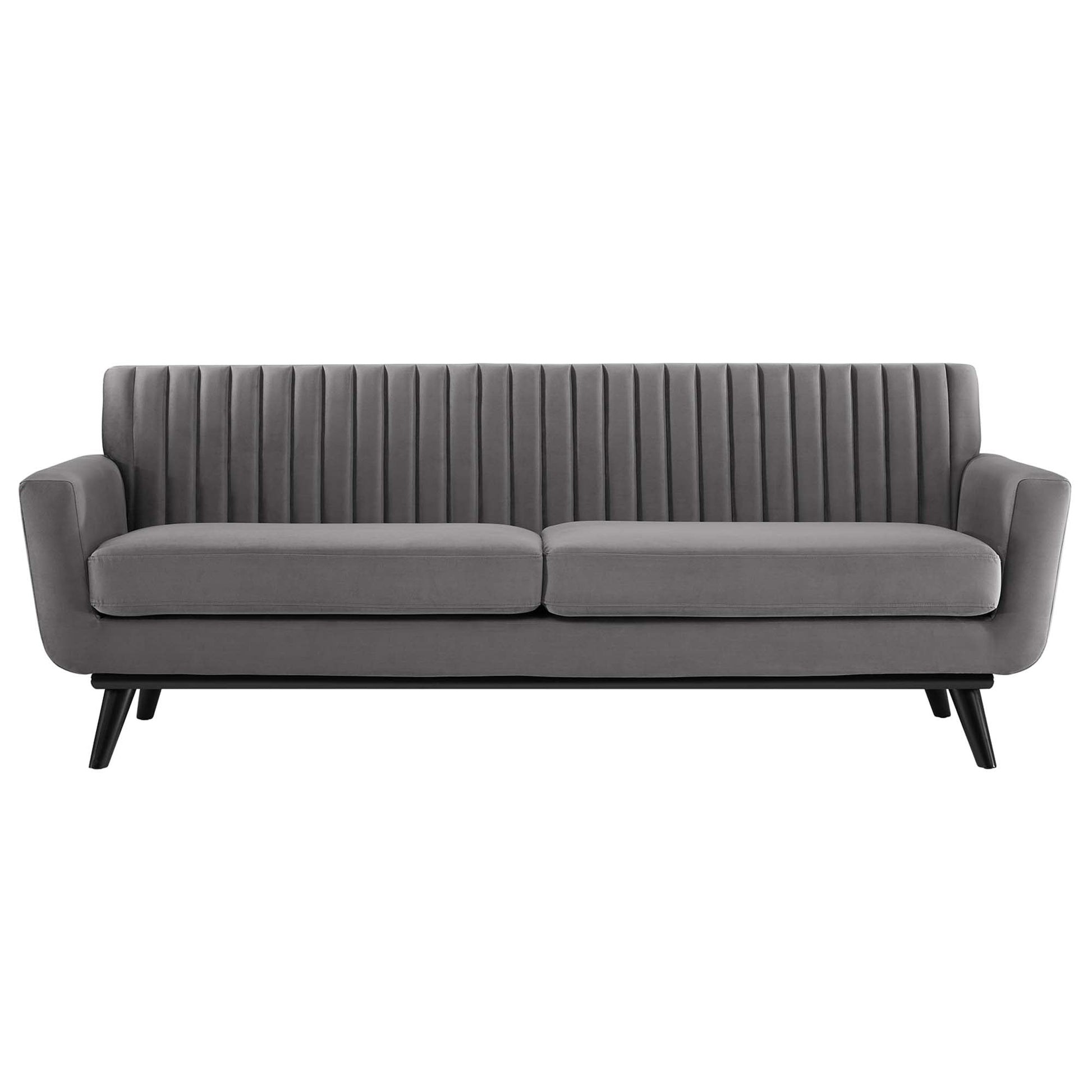 Gently sloping curves and plush seat cushion create a favorite lounging spot. Whether relaxing after a long day at work, settling in with coffee and brunch, or entering a spirited discussion with friends, the Engage Sofa is a welcome presence in your home. Channel tufting creates eye-catching appeal, adding depth that brings your sitting décor to center stage. The black painted rubberwood legs and frame offer a solid base for the stain-resistant performance velvet upholstery.