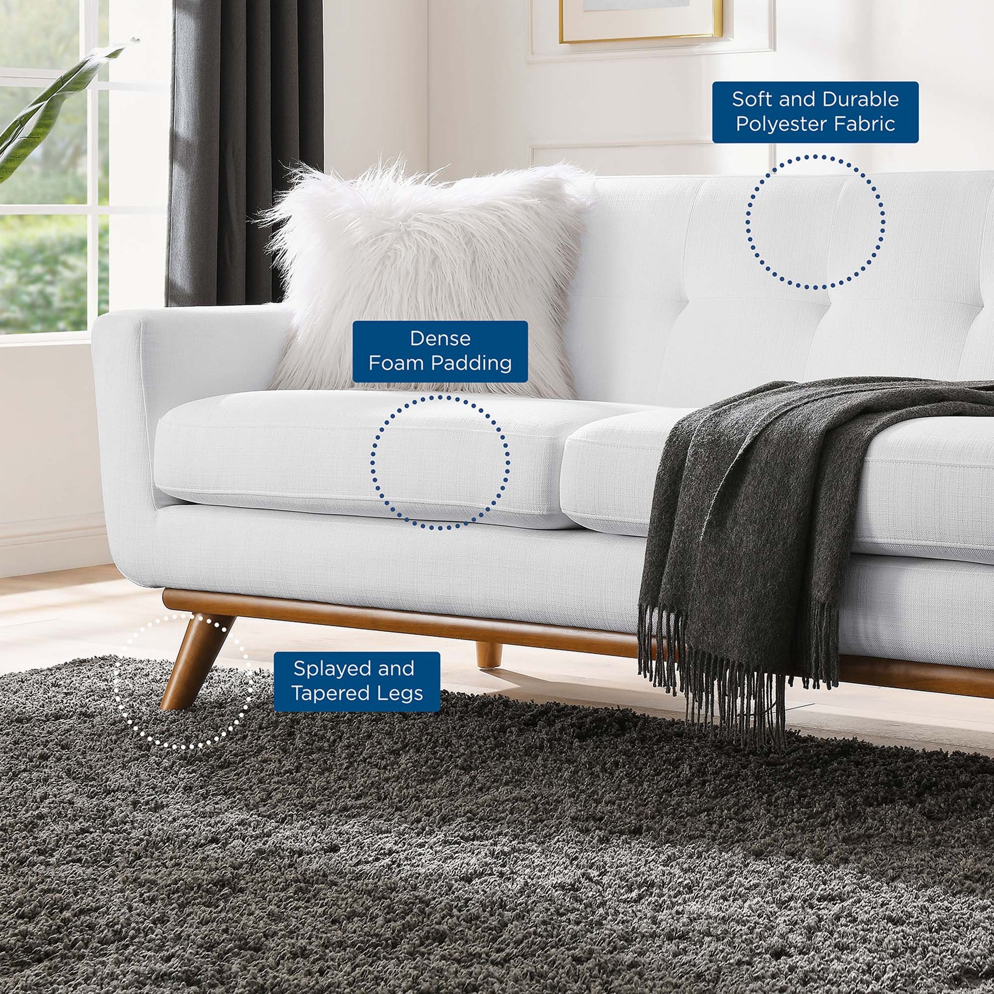 Gently sloping curves and large dual cushions create a favorite lounging spot. Whether relaxing after a long day at work, settling in with coffee and brunch, or entering a spirited discussion with friends, the Engage Sectional Sofa is a welcome presence in your home. Buttons create eye-catching appeal, adding depth that brings your sitting décor to center stage. Four rubberwood legs and frame supply a solid base to the comfortable upholstered material.