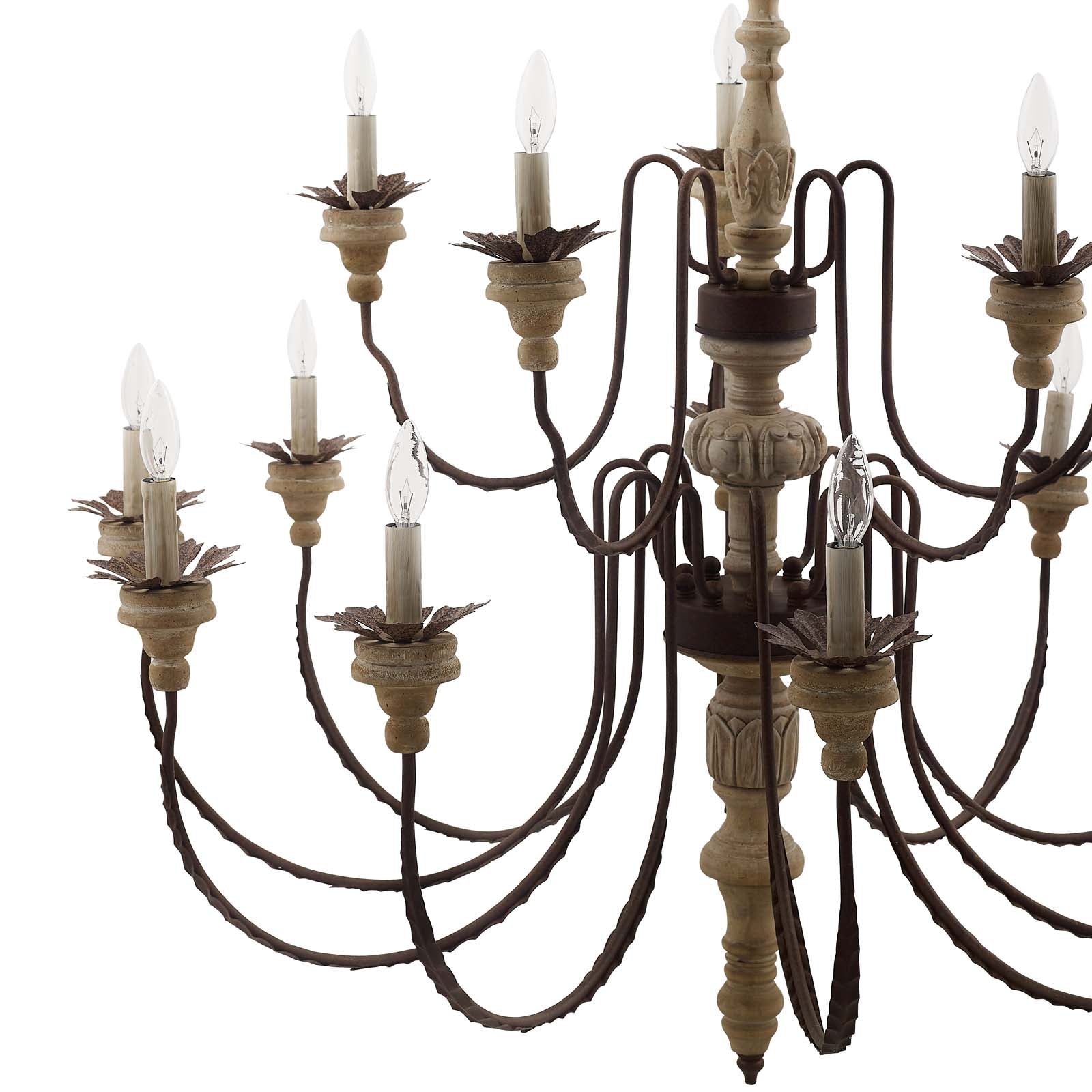 Elevate your home with the timeless elegance of the Nobility Candelabra Chandelier. A vibrant addition to your living room, bedroom, foyer, or dining room, this French vintage pendant chandelier features sweeping, leaf designed metal arms, a beautifully carved, tiered natural wood center column, and candle-style light holders each surrounded by an ornate leaf design. Nobility hangs from a 45.3" metal chain with a flush wall mount and grants chateau charm to your home. This modern farmhouse pendant chandelier requires fifteen E12 25-watt light bulbs (not included).