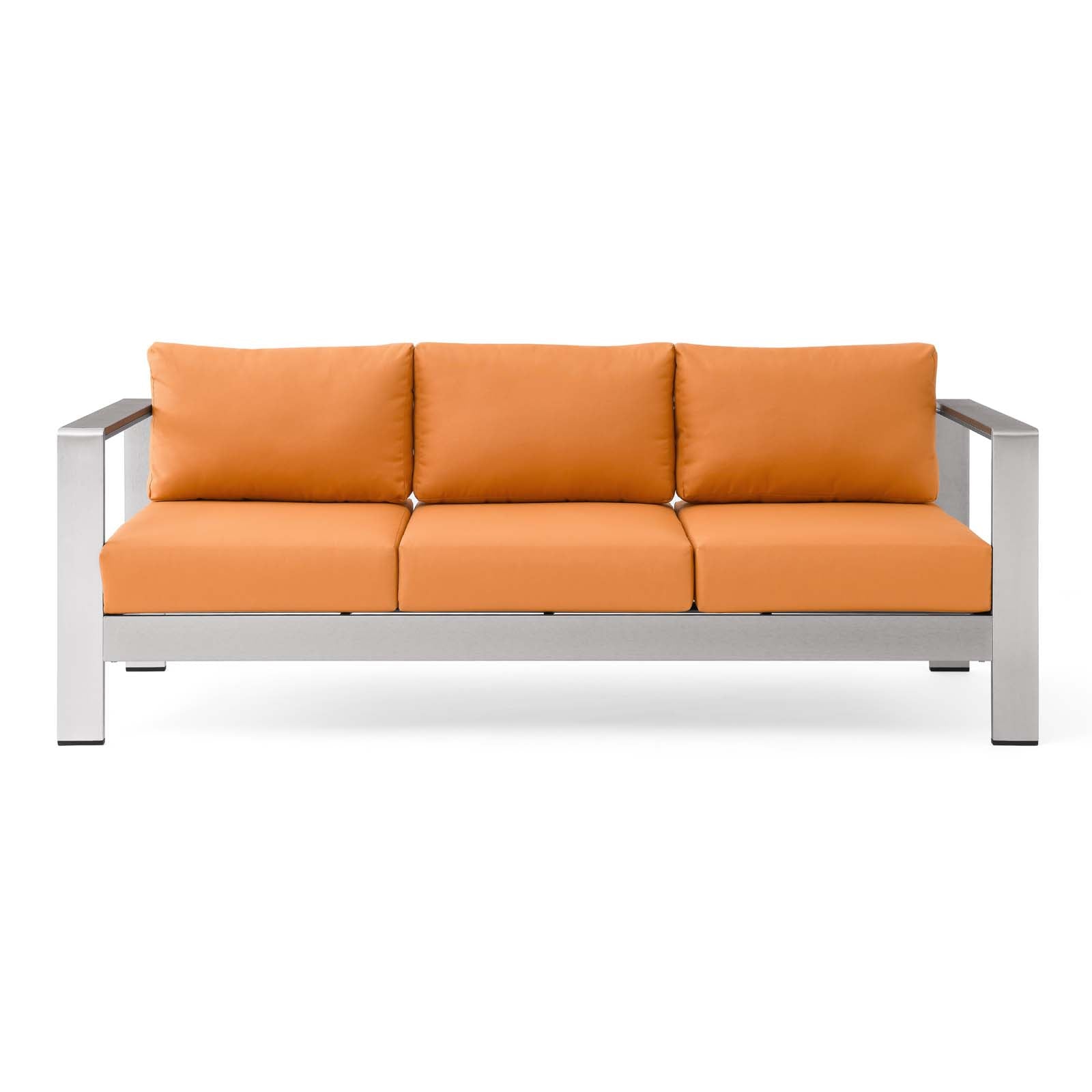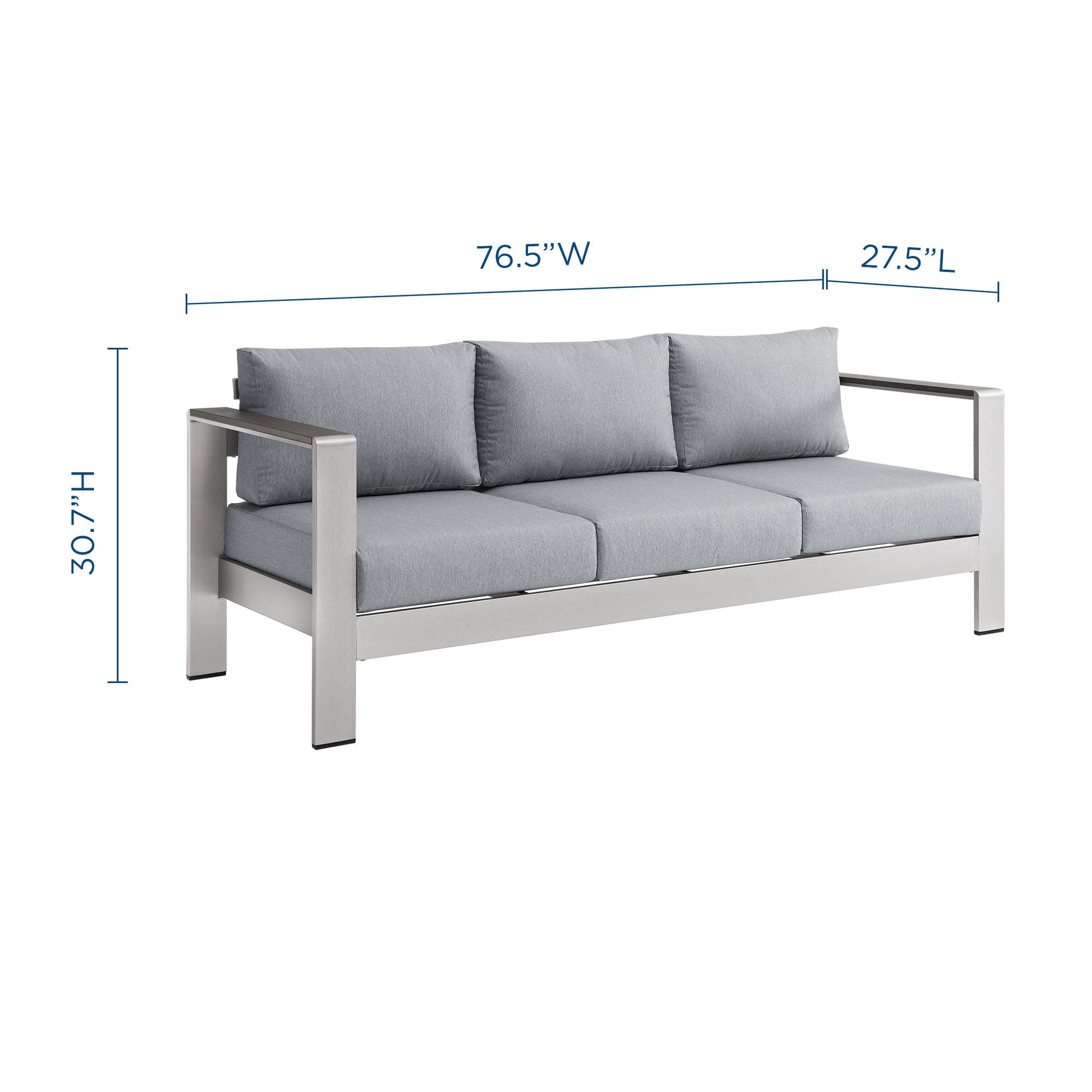 Enjoy your patio or backyard leisure time with the strong and durable Shore Outdoor Patio Aluminum Sofa. Made with an anodized brushed aluminum frame and non-marking black plastic foot caps, Shore Patio Sofa comes outfitted with removable, resilient fabric canvas cushions that are easy-to-clean and tested to last through all weather conditions. The Shore Outdoor 3-Seater Sofa complements your casual gatherings with a look and functionality you can rely on. Sofa Weight Capacity: 900 lbs.