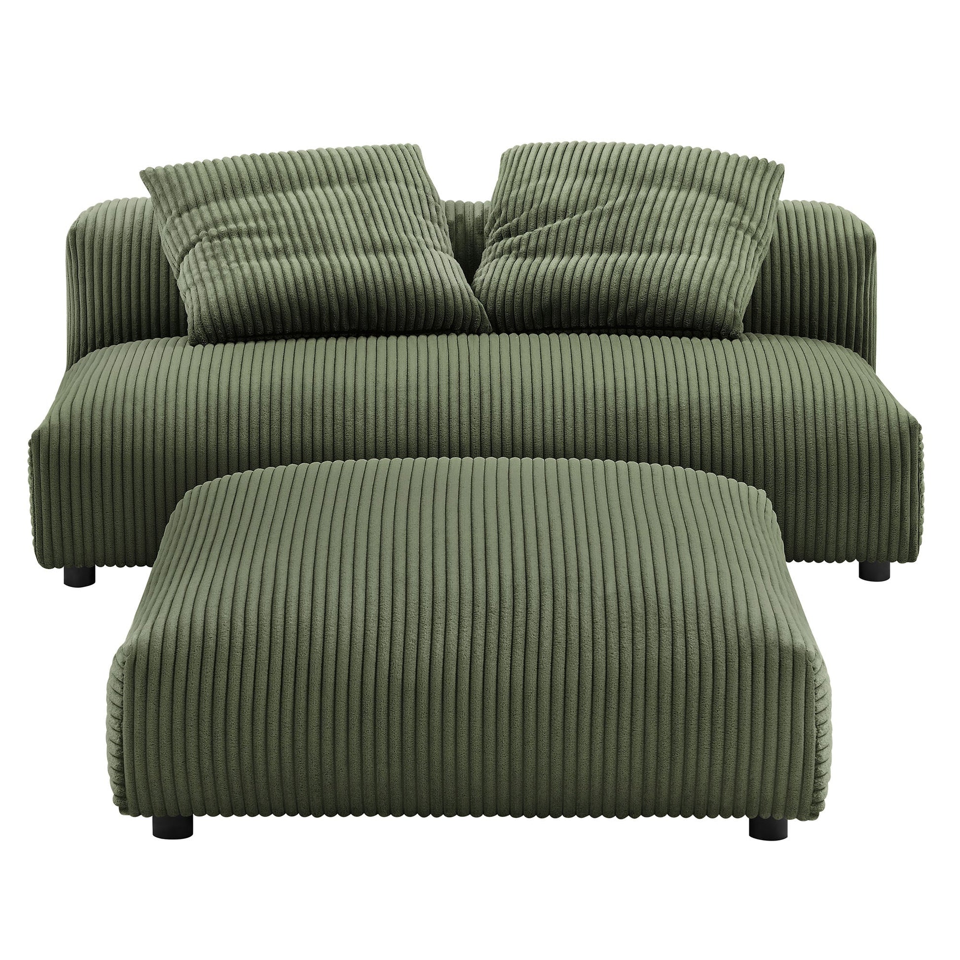 Revel in ultimate comfort and modern style with the Solace Modular Corduroy Armless Loveseat and Ottoman Set. This oversized corduroy armless loveseat with a matching ottoman is perfect for any living room, offering endless flexibility. Its modular furniture design allows you to change the arrangement to suit the needs of the moment or expand your seating by adding more pieces in the future. Featuring a sturdy frame, dense foam padding, and a sinuous spring support system, the Solace Small Sofa Couch grants a premium seating experience. The comfy corduroy upholstery adds a cozy, casual vibe, making this armless two-seater sofa a perfect addition to any living space or lounge area. Equipped with non-marking plastic glides and complementing accent pillows, this loveseat sectional is both stylish and practical. With no assembly required, you can enjoy immediate relaxation with this loveseat sofa with ottoman set. Loveseat Weight Capacity: 800 lbs., Ottoman Weight Capacity: 500 lbs.