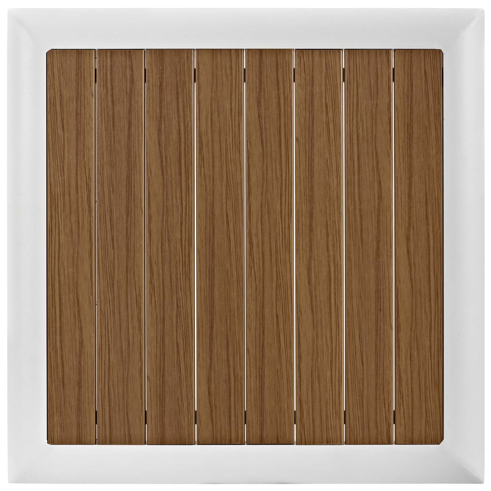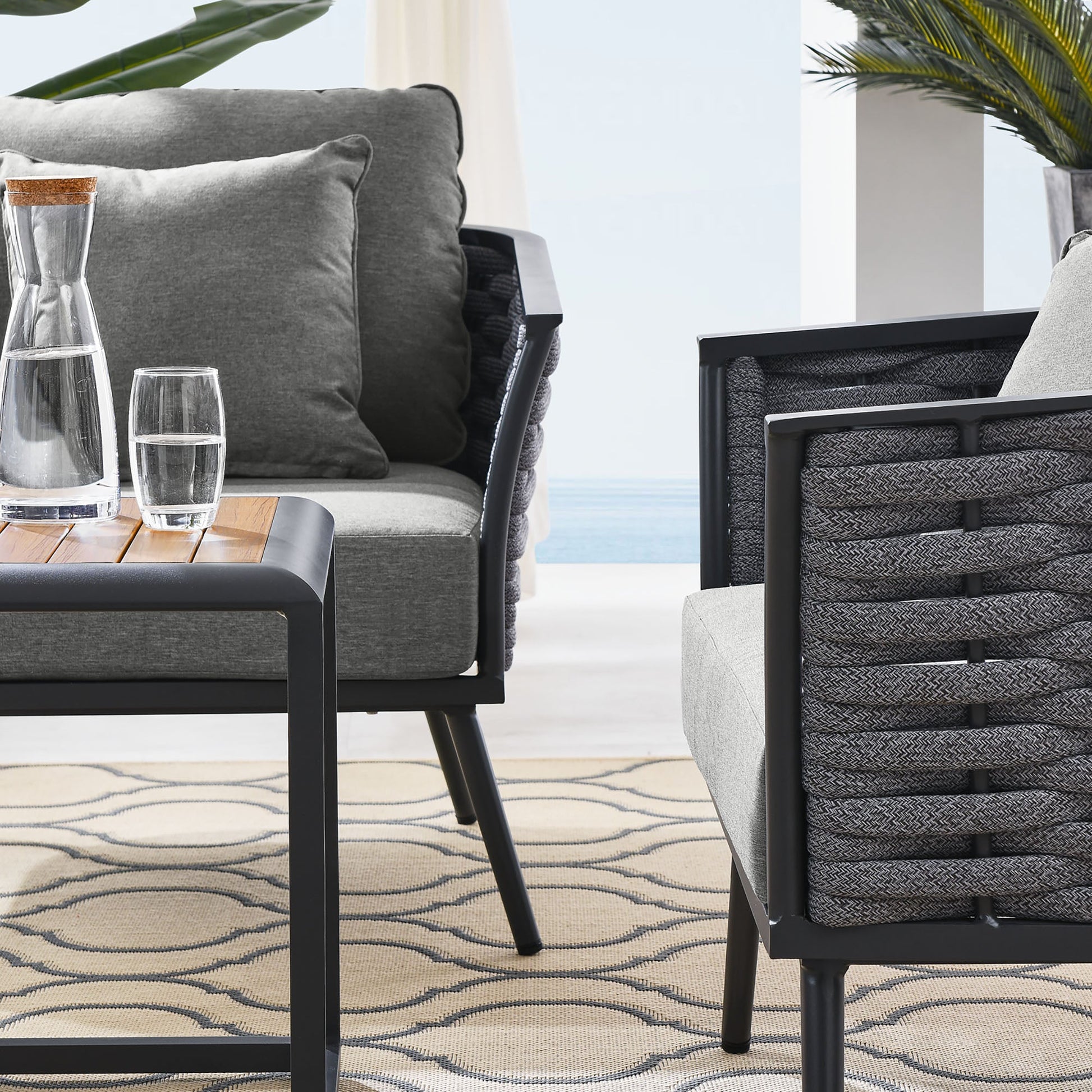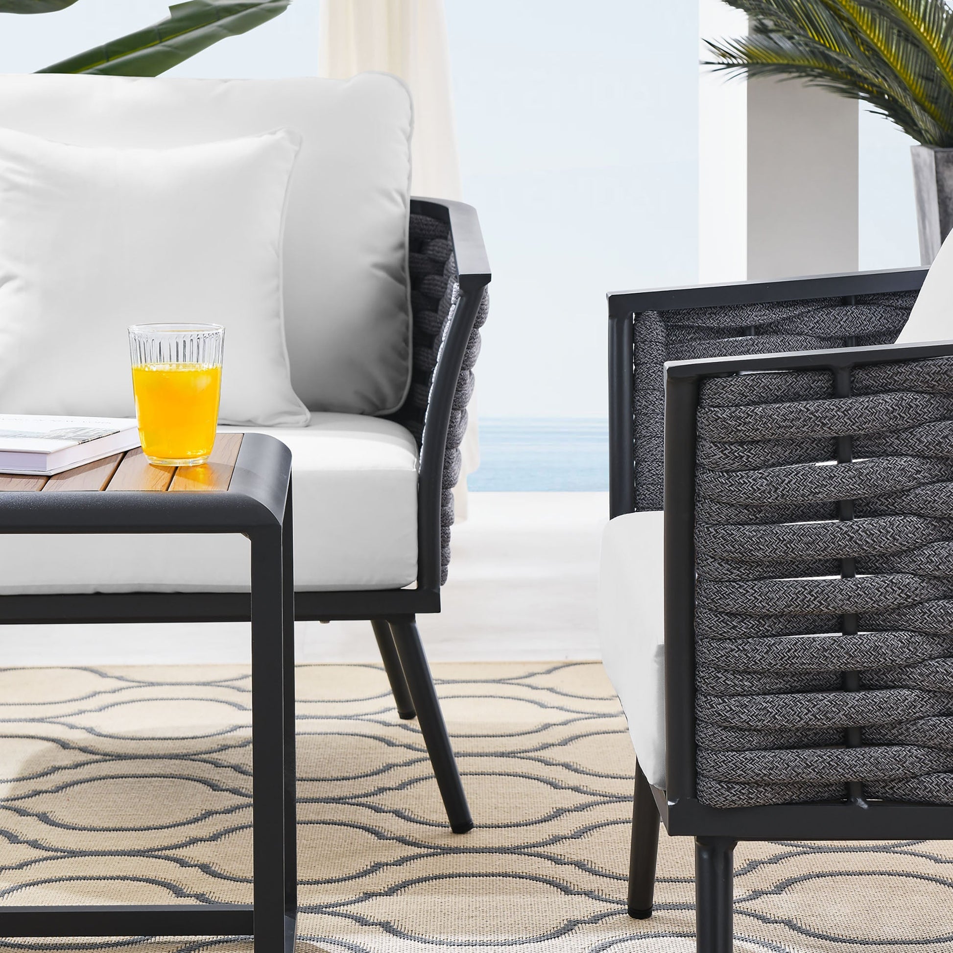 Gather family and friends for pleasant weather and good conversation with the Stance Outdoor Collection. Boasting a contemporary modern look, Stance features woven polyester fabric rope seat back and flared powder-coated aluminum frame, slatted synthetic wood tabletops, and waterproof all-weather fabric cushions with plush 5" thick, dense foam padding provide a relaxing spot to lounge. A versatile set designed for long-lasting durability, each piece in the Stance Collection can be mixed and matched and effortlessly arranged to fit the spontaneous needs of you and your guests. Cushion Thickness: 5"H. Chair Weight Capacity: 331 lbs. / Sofa Weight Capacity: 551 lbs.
