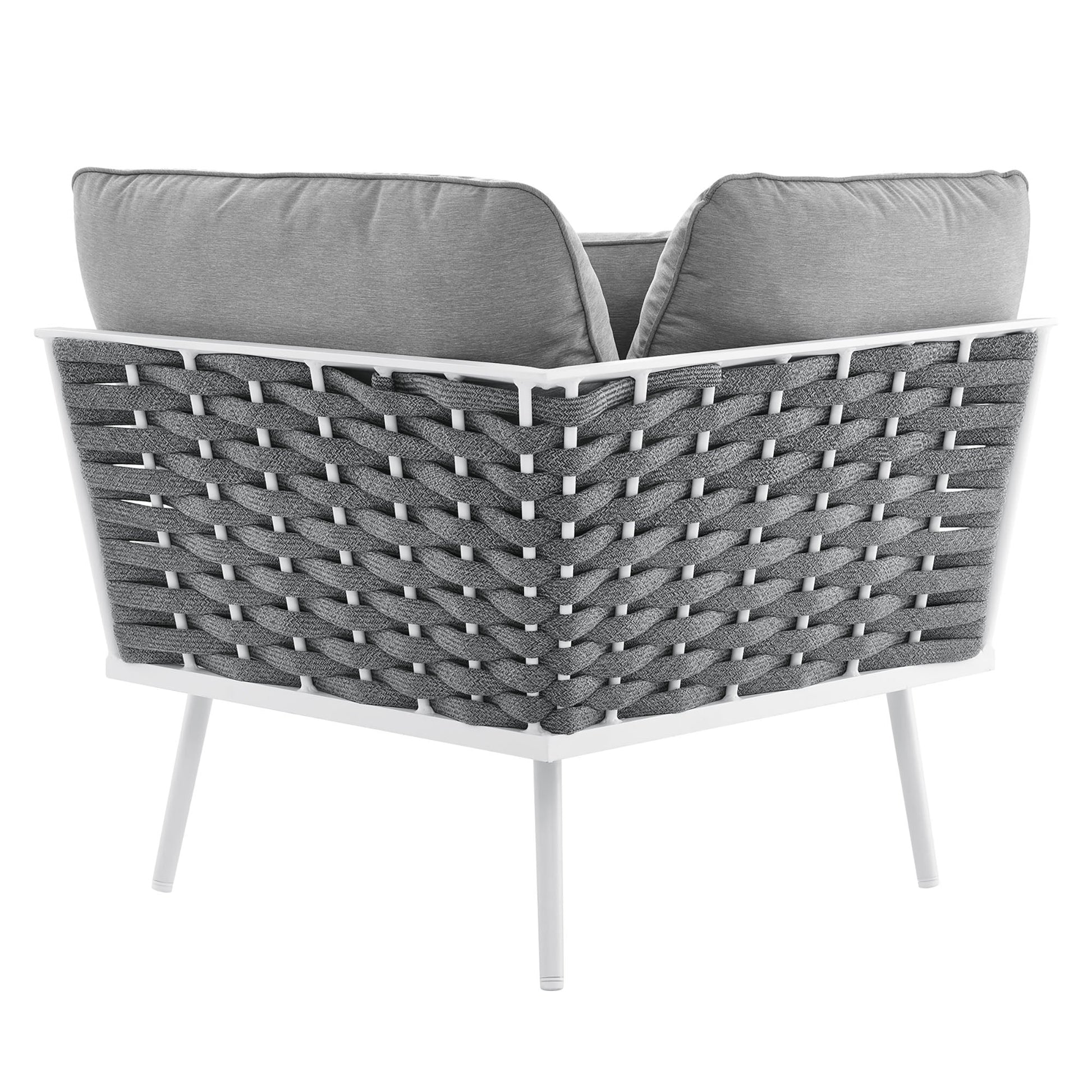 Gather family and friends for pleasant weather and good conversation with the Stance Outdoor Patio Sectional Sofa. Boasting a contemporary modern look, Stance Outdoor Patio Sectional Sofa features woven polyester fabric rope seat back and flared powder-coated aluminum frame, while water resistant all-weather fabric cushions with dense foam padding provide a relaxing spot to lounge. A versatile patio sectional designed for long-lasting durability, each piece in the Stance Outdoor Patio Collection can be mixed and matched and effortlessly arranged to fit the spontaneous needs of you and your guests. Stance includes non-marking, height-adjustable foot caps. Assembly Required. Set Includes: 1 Left-Facing Armchair, 1 Right-Facing Armchair, 1 Armless Chair, 1 Corner Chair