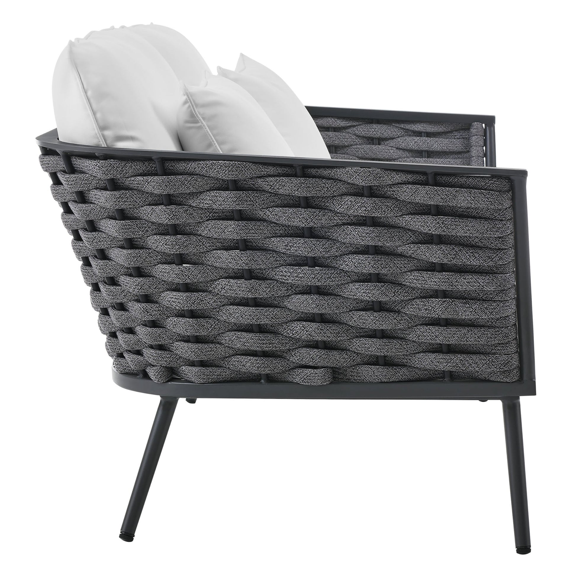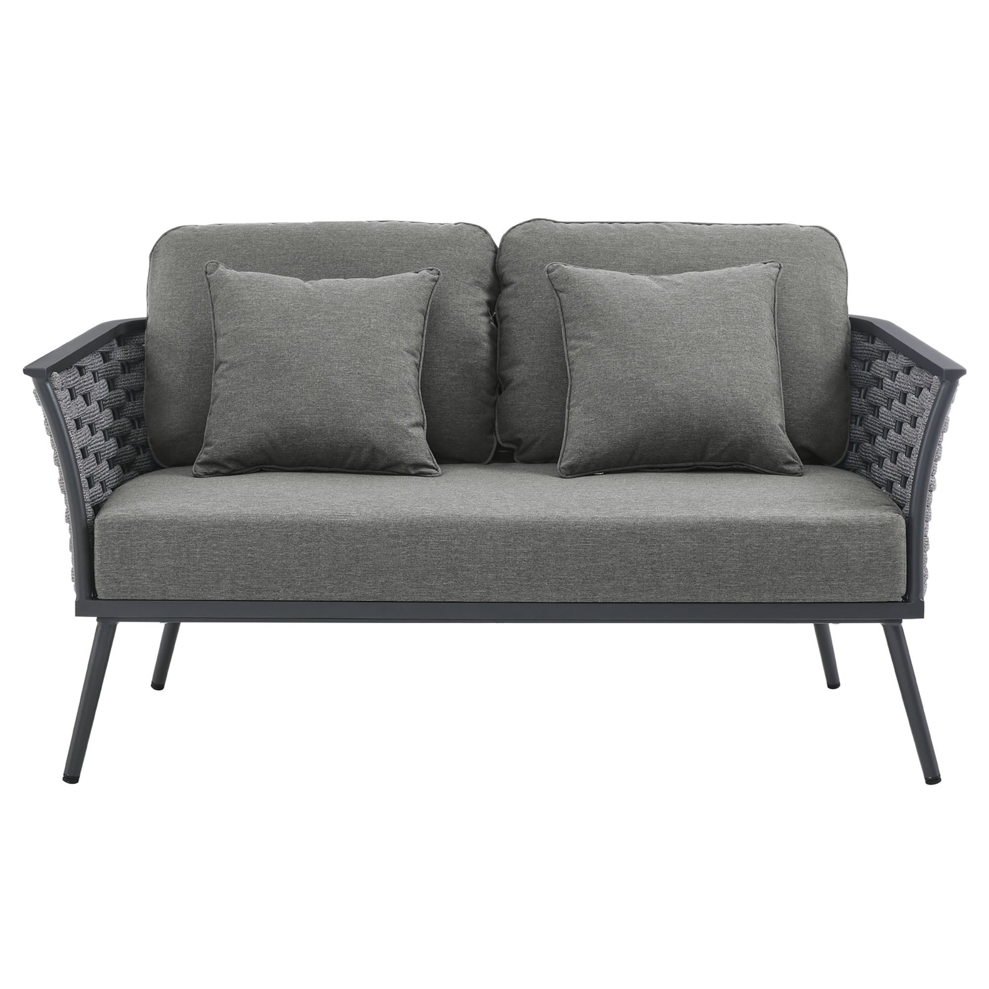 Gather family and friends for pleasant weather and good conversation with the Stance Outdoor Collection. Boasting a contemporary modern look, Stance features woven polyester fabric rope seat back and flared powder-coated aluminum frame, while waterproof all-weather fabric cushions with dense foam padding provide a relaxing spot to lounge. A versatile set designed for long-lasting durability, each piece in the Stance Collection can be mixed and matched and effortlessly arranged to fit the spontaneous needs of you and your guests. Loveseat Weight Capacity: 440 lbs.