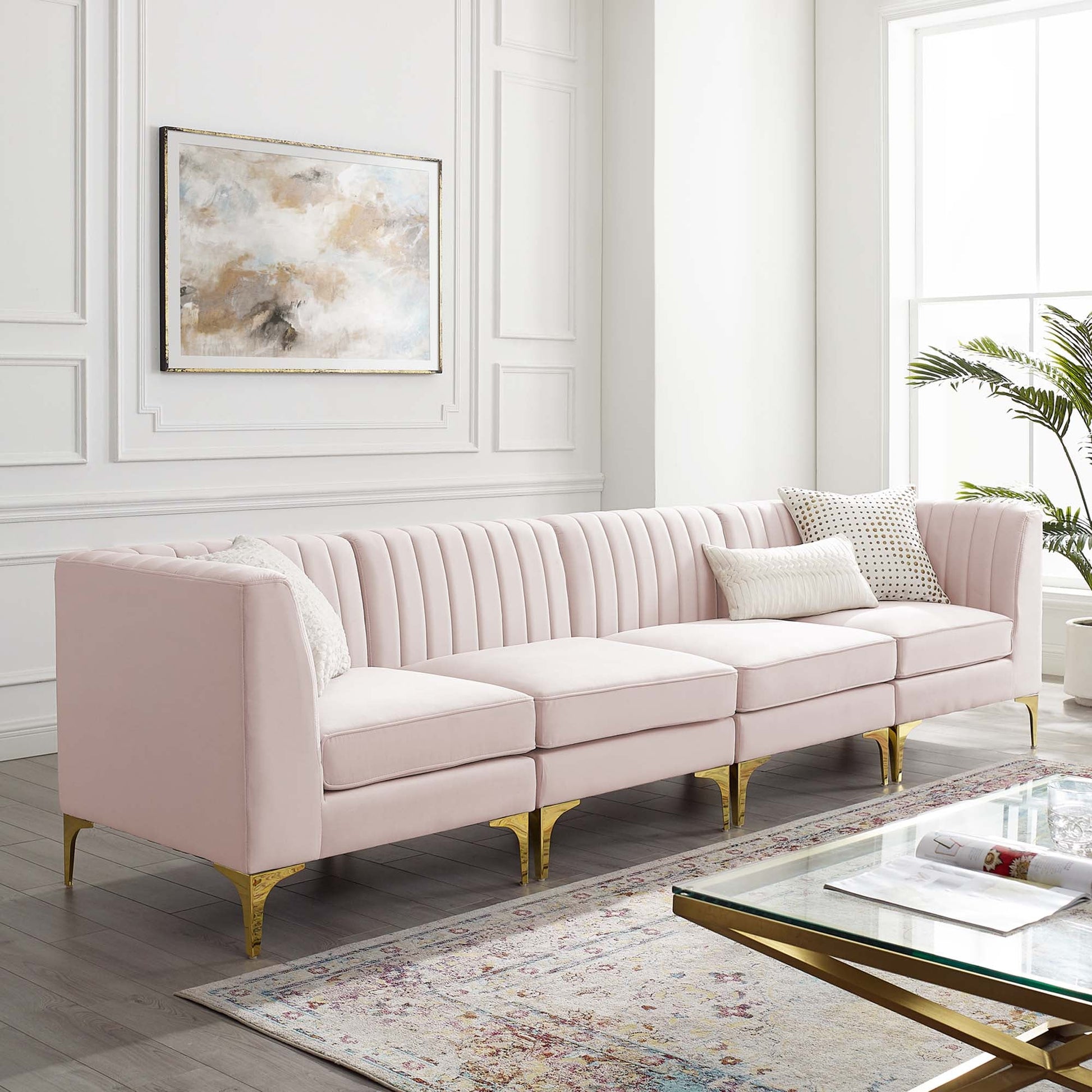 Elevate your living space with the visual appeal and linear detail of the Triumph Channel Tufted Performance Velvet Sofa. With interior channel tufting and luxe velvety texture, this sofa abounds in retro modern style and glam deco charm. This couch is part of a sectional sofa collection that allows you to create a seating solution that works for your living room, bedroom, office space, entryway, or lounge area. This upholstered sectional sofa is covered in stain-resistant performance velvet and features dense foam padding and a sinuous spring support system for a premium seating experience. The velvet sofa sits on gold metal legs with non-marking foot caps to protect your flooring. Weight Capacity for Each Sectional Sofa Piece: 440 lbs.