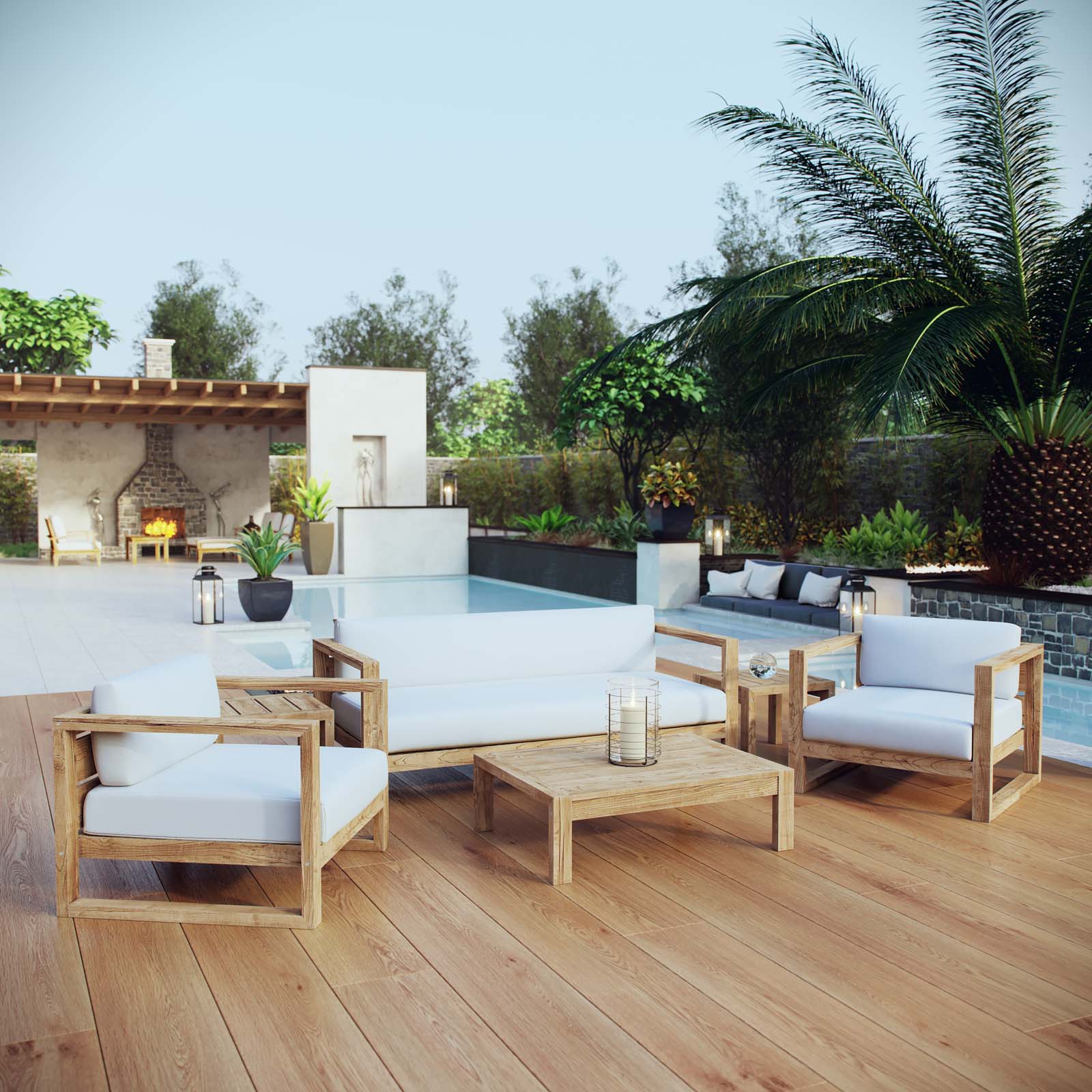 Refresh your outdoor décor with the Upland Teak Outdoor Collection. Boldly designed with eye-catching appeal, Upland is made of solid teak wood with all-weather white cushions and solidly build construction. The perfect choice for balconies, backyards, patios, gazebos, poolside or garden spaces, choose from matching armchair, loveseat, ottoman, side table, coffee table, and chaise lounge selections with this multi-purpose modern teak set. Known for its ability to withstand extreme weather conditions, teak is the wood selection of choice for long-lasting outdoor furnishings. Assembly required.