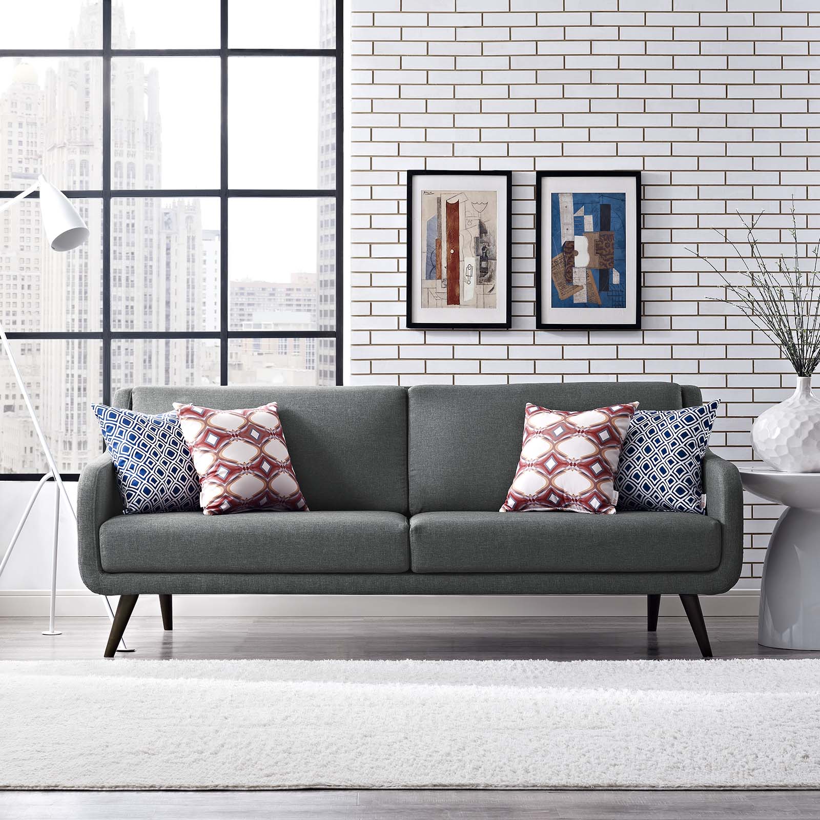 Be counted with Verve. Designed to be a spirited and enthusiastic piece that exudes mid-century charm, Verve leaves a lasting impression with its free-flowing organic form and minimalist elegance. Solidly made with exceptional support, Verve features dense foam cushioning, espresso stained wood legs and generous seating space. This mid-century inspired sofa is perfect for modern and eclectic living rooms, lounge spaces, and reception areas.
