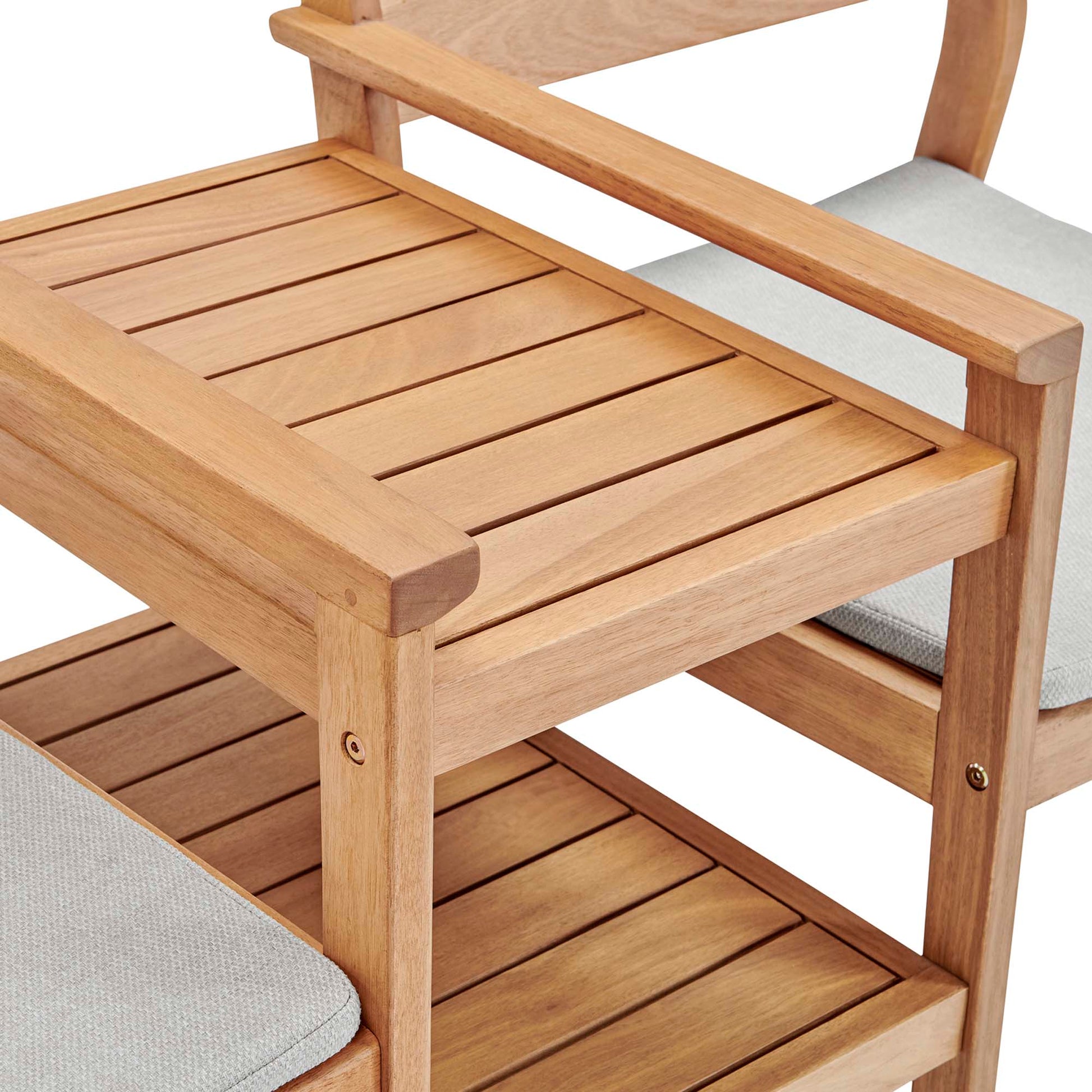 Enjoy both cottage charm and a sleek style with the Viewscape Outdoor Patio Jack and Jill Chair Set. Constructed from FSC certified ash wood, this patio set comes with two armchairs and an integrated table for a substantial addition to your outdoor furniture decor. Complete with a slatted wood frame for natural airflow, and four tapered legs, each patio armchair has an all-weather removable cushion for easy cleaning. With ribbons to secure the cushion onto the seat base, this Jack and Jill chair set evokes the rustic style of wooded cabins and lakeside houses. A perfect addition to the patio, deck, porch, or poolside. Chair Weight Capacity: 331 lbs.